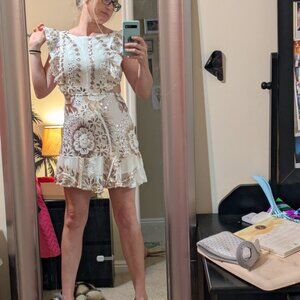 Super cute white with gold accents, sequins dress. Mostly backless. Never been worn.