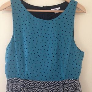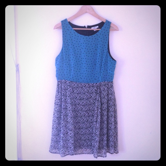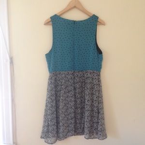 This dress is super cute! It's an XL but runs a bit small. Barely worn, the top is turquoise with black polka dots, and the bottom is a fun black and white pattern.