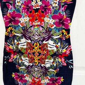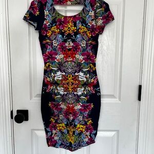 This dress is a high quality stretch fabric that shapes curves perfectly. Colorful print and flattering fit. Perfect for a night out. Worn one time