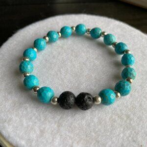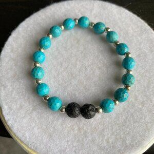 This is a handmade by me turquoise beaded bracelet with silver separaters and three lava rocks for essential oils if you choose to. Approximately 7". Never worn!