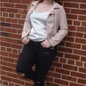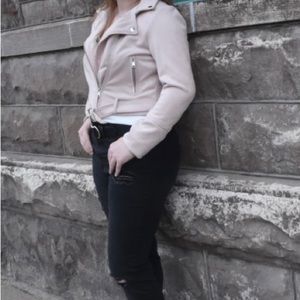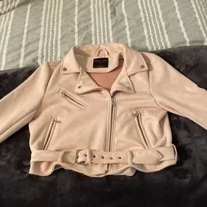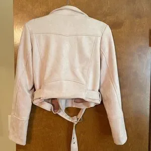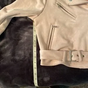 Light pink/mauve colored jacket, buckle at waist, fun pockets. It’s almost like a faux suede feel, 90% polyester/10% spandex. Worn only one time for pictures.