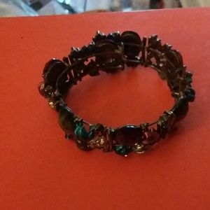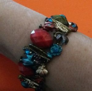 The vintage style, floral inspired slip on cuff/bangle bracelet is a perfect finishing touch for a casual party outfit. Glass stones set in a gold tone wire frame include red, smoky brown, burgundy with aqua blue accents. A nice piece of costume jewelry. Wire is slightly bent on inside of cuff but doesn't affect look. Purchased approximately 5 years ago but never wore.