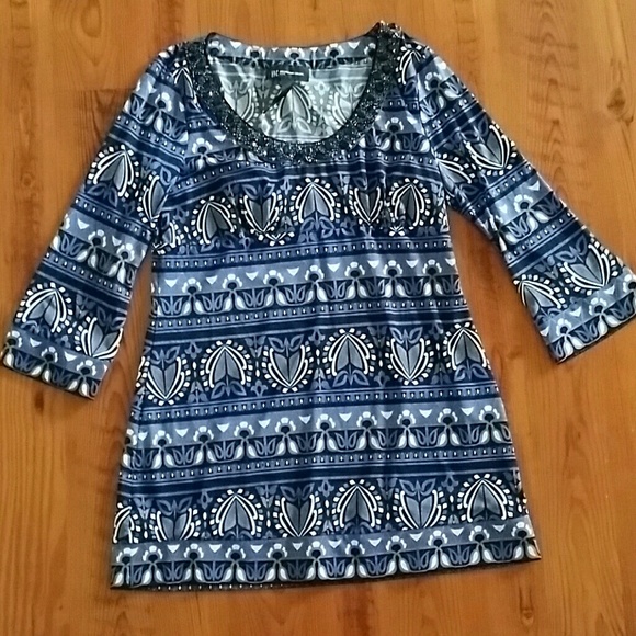 Blue, black, grey and white patterned top in a slinky fabric. There's stonework at the neck and it gathers under the bust for a truly flattering shape.