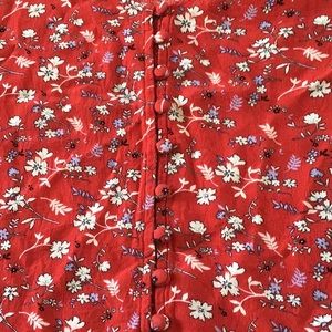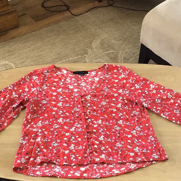 Cherry red color, 3/4 sleeves w/elastic, short waisted, 100% rayon, last picture shows true color, button down w/covered buttons