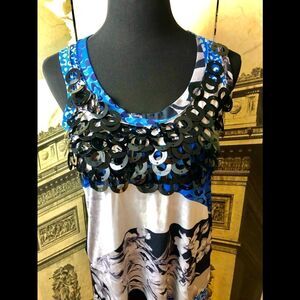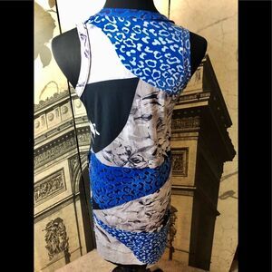 Fun retro dress. Label has been removed. It feels like a polyester blend. Size large. Some wear on the rings priced accordingly.