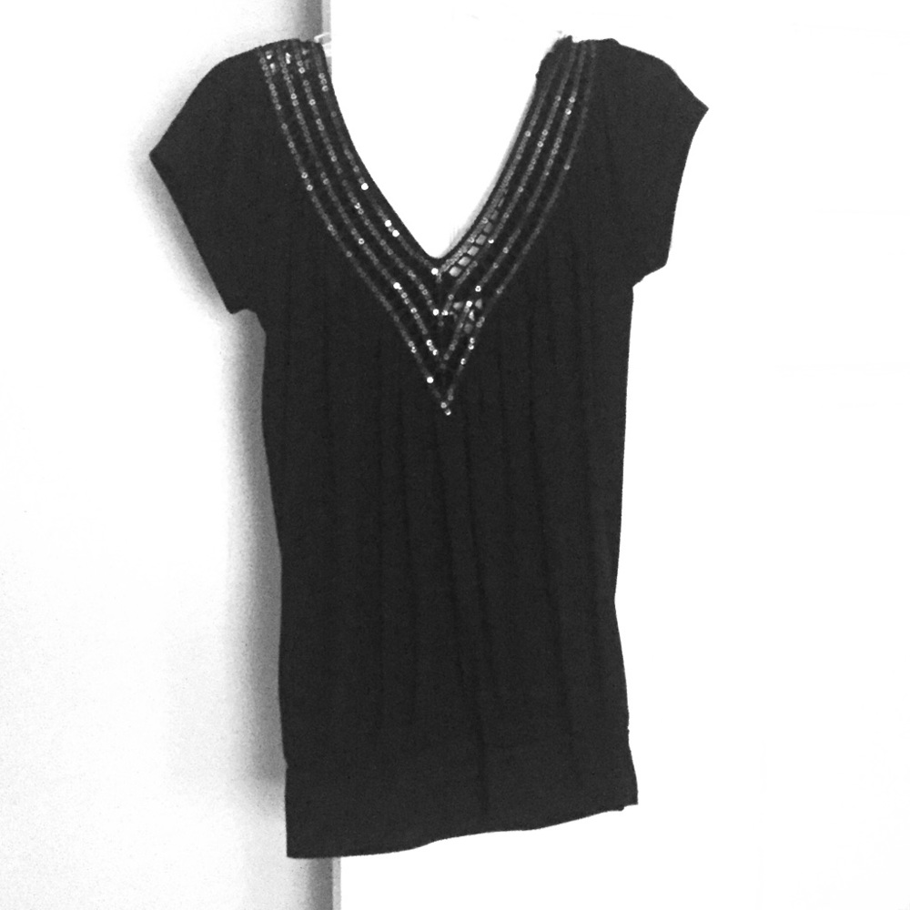 Flattering black top with sequins. V neck in front and back. Good used condition. Some general wear.