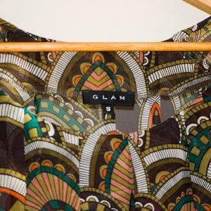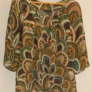Retro-paisley-esque print on this high-quality blouse originally purchased at a local boutique. Fabric is relatively sheer (take a look at how much you can see the hanger through the fabric in the photo of the full blouse) and sleeves are loose-fitting and flowy.