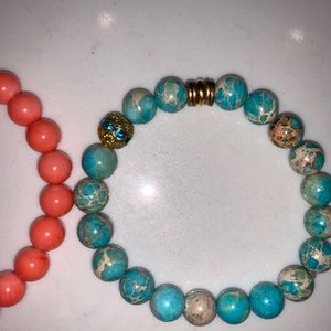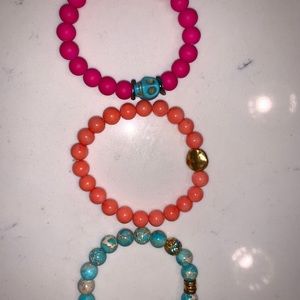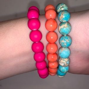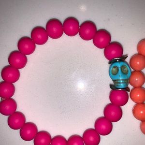 Pink, orange and blue bracelet set with skull, gold and blue accents.