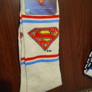 3 pair of fun socks. Adult shoe size 6-12. New. Superman, Nutter Butter and Tootsie Roll Pop.