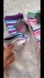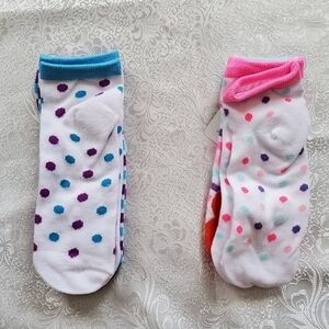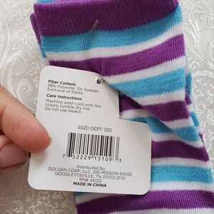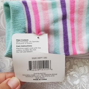 one pair fox socks with white, light pink, neon pink, teal, & purple stripes