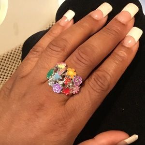 This is a super cute stretch Fun ring. I mean it looks good on and hand or finger. One of a kind hard to find but I have it..metal surrounding that’s very strong and the ring never moves around. Metal fun ring has a butterfly, ladybug, star and different color flowers bottom. Show small fainting color but doesn’t disturb the beauty.