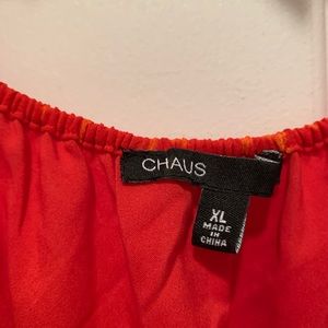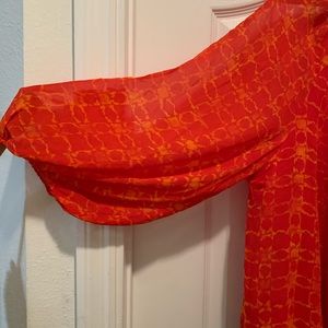Orange pattern; lined body; sheer sleeves. Elastic around waist, neck and sleeves make this versatile!