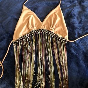 I’m not exactly sure what to call this style of top but it’s super cute for going out. I used it went I went out and also once for Halloween as a cowgirl and it’s in very good condition. It has strings to tie the top and more to tie beneath the boobs to hold everything in and make it as loose or tight as you like so it fits many different sizes!