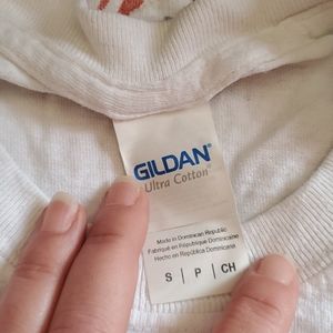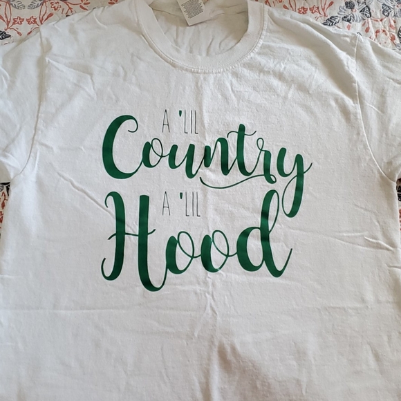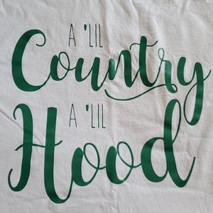 White small tshirt. Green lettering that says "A lil country a lil hood"