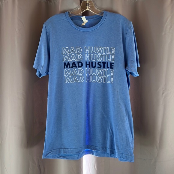 Soft blue tshirt in size large with “Mad Hustle” printed on the front. Length from shoulder to hem is 27”.