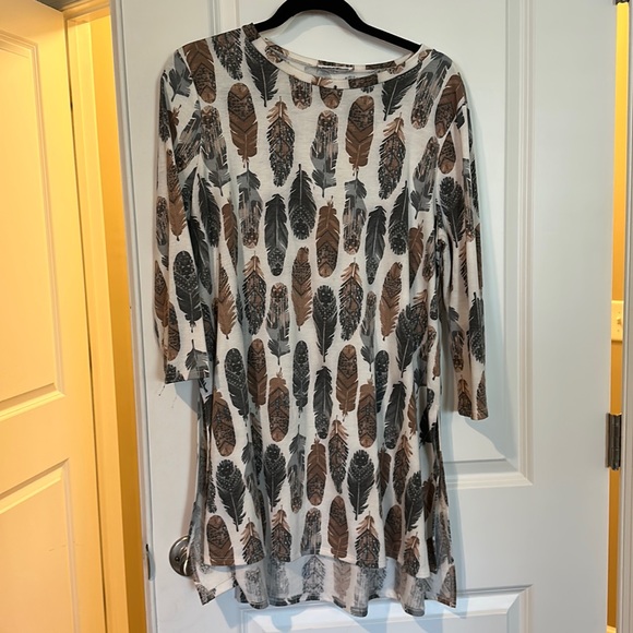 Tunic top with bird feathers in different muted colors.