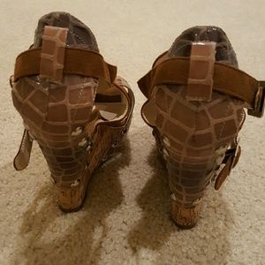 Very fun, faux snake skin accents, ankle straps, 4 inch wedge heels; worn only once