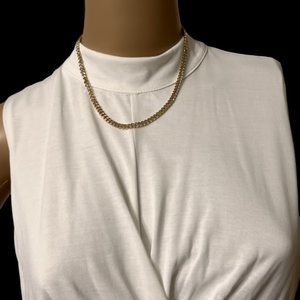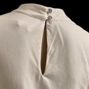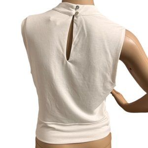 White top, almost-crop depending on your size and pants. With high rise pants it would likely show very little skin. Fabric is extremely soft and thicker, not see through. Two button closure in the back. Very classy top that can be dressed up or down.