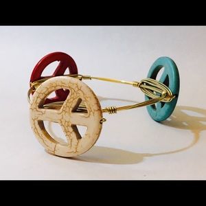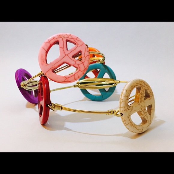 This is a fun, hand-made with large howlite peace sign beads with gold wire. This chic bangle makes a perfect gift or a fun piece for yourself! Bangles are perfect for stacking. This listing is for one bangle only. Will bundle.