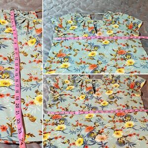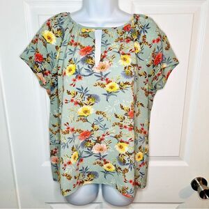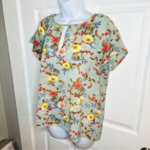 Fun 2 Fun Floral Flutter Sleeve Cutout Back Blouse Muted Green Multicolor Size Medium. Short cap sleeves. Beautiful muted colors of flowers. Relaxed fit. Keyhole neck. Back cutout. Polyester. Gently used Good Preowned Condition.