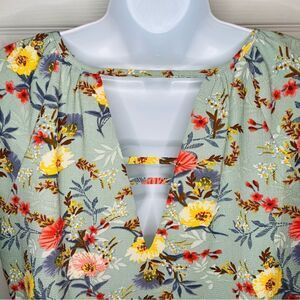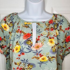 Fun 2 Fun Floral Flutter Sleeve Cutout Back Blouse Muted Green Multicolor Size Medium. Short cap sleeves. Beautiful muted colors of flowers. Relaxed fit. Keyhole neck. Back cutout. Polyester. Gently used Good Preowned Condition.