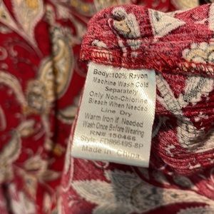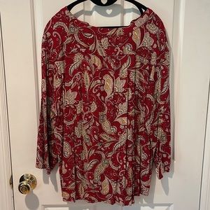 Fabulous Fun2Fun blouse in a deep burgundy red, yellow, and black paisley print. Lightweight rayon crinkle material and henley style pairs perfectly with your favorite jeans and flats. Purchased from Stitch Fix and worn a couple times. Great pre loved condition. Size 2X.