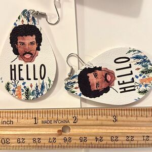 These earrings are a fun and playful way to show your love for Lionel Richie and his iconic song "Hello". The cartoon illustration of the singer with his signature afro and the word "HELLO" adds a touch of nostalgia and humor to the design.