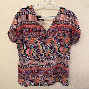 This fun multi color short sleeve top is from Fun & Flirt. The item has a scoop neck with a zipper on the back. The top is made from 100% polyester. The size is medium. The measurements are 25” L x 21” W (pit to pit) x 9” sleeve (collar to cuff). This top has been gently worn but is in very good condition.
