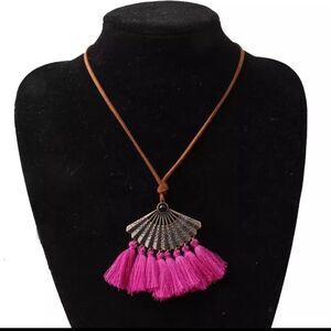 Fun Long Pink Tassel Necklace w/ Brown Cord