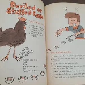 Colorful vintage cookbook with playful illustrations. Features a large purple pan and characters in chef hats.