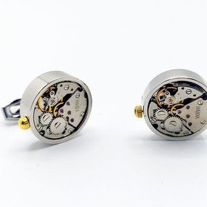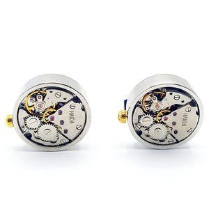 Crafted from brushed steel, these cufflinks feature a miniature watch movement in gold and silver tones.