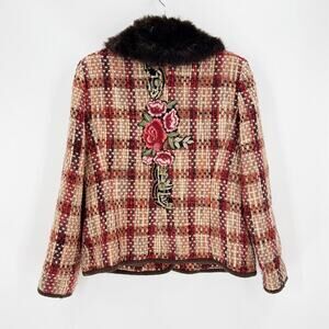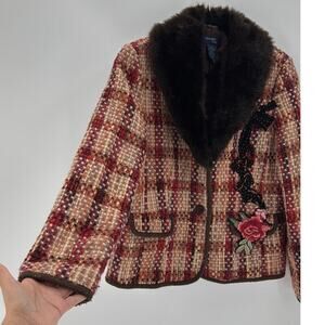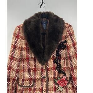 Fundamental Things jacket Tweed faux fur Collared embroidered flower size 12