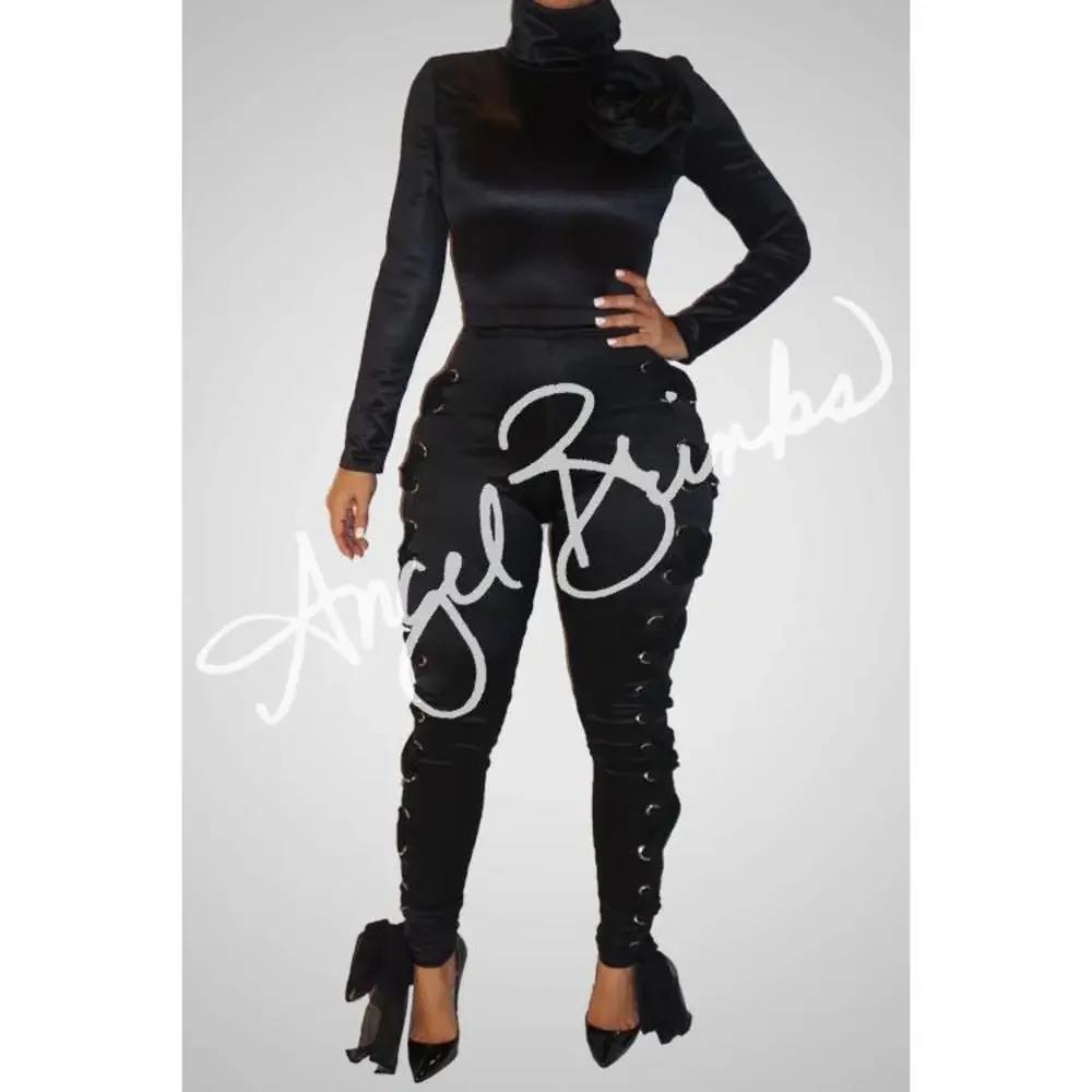 This all black legging set is both comfortable and stylish. The side straps add a sexy and edgy touch, while the top and bottom both zip up in the back. Dress it up with some heels and accessories for a stunning look. This item is also stretchy for added comfort.