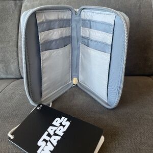 The allover print of this wallet features a motif of Ahsoka, Grogu , and Ahsoka’s facial markings against a cool grey background