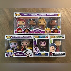 Collection of new and like new Funko Pop figures featuring Disney Princesses and Villains. Ideal for fans and collectors.