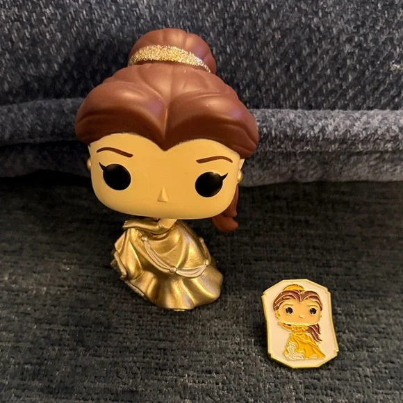 Funko Pop figure in a shimmering gold dress. Features brown hair. Comes with a matching pin.