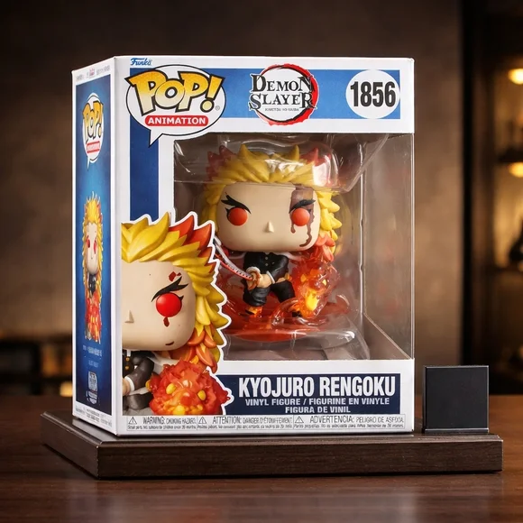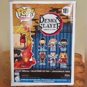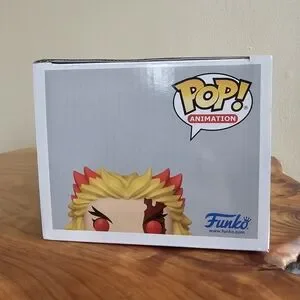 Official Funko Pop! Animation figure of Kyojuro Rengoku. Bright yellow hair with red flame details. Includes fiery flame base and detailed paint. Display-ready in window box. Great for Demon Slayer collectors.