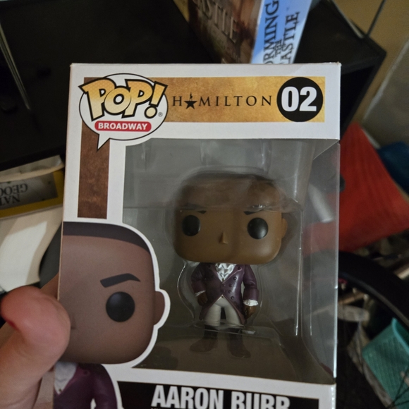 Funko Pop! Broadway figure of Aaron Burr from Hamilton. Features a detailed design with a purple outfit. box has a tear.