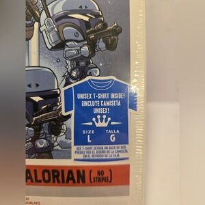 The Funko Pop Tees Mandolorian Unisex Tee in size Large is a short sleeve shirt featuring a design inspired by the popular Star Wars series. Made of vinyl material, this collectible figure is part of Funko's Pop! Vinyl product line. The tee and figurine combo is a must-have for fans of the franchise, allowing for both clothing and figurine collection in one. Perfect for displaying and adding a touch of Star Wars flair to any wardrobe.