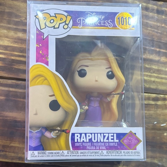 Funko Pop figure of Rapunzel. Features long blonde hair and a purple dress.
