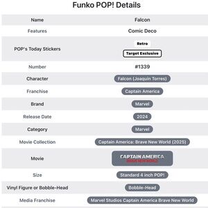 Brand-new Funko Pop! Falcon #1339 from Marvel Studios Captain America: Brave New World. Exclusive “Only at Target” edition featuring Falcon in his detailed green armor suit with wings extended.