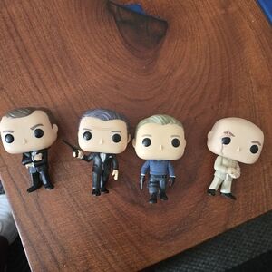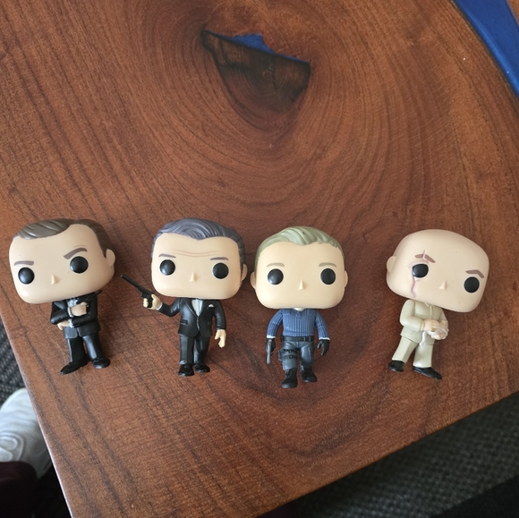 Set of four Funko Pop figures. Each has unique attire. Perfect for collectors from James Bond Movies, no box included