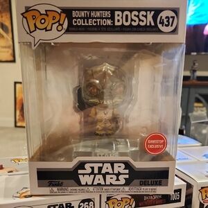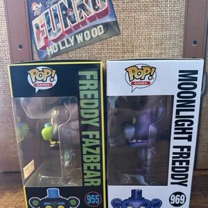 Funko Pop figures of Freddy Fazbear and Moonlight Freddy. Features bold black, green, and purple colors. Exclusive designs.