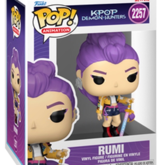 Funko Pop! Animation figure of Rumi. Features vibrant purple hair and black outfit. Includes detailed accessories.