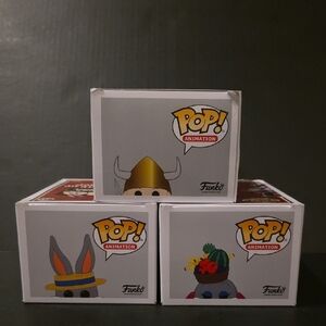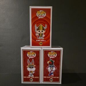 Set of three Funko Pop! Includes Elmer Fudd in opera outfit. Bugs Bunny in show outfit and fruit hat.