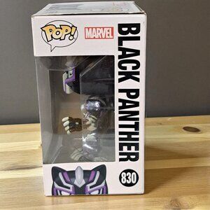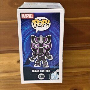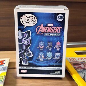 Funko Pop vinyl figure from the Marvel Avengers Mech Strike collection, featuring the character Black Panther. This particular figure is part of the Marvel franchise and is made of vinyl material. The box is numbered 830 and may have minor damage, but the Black Panther figure inside is in standard size and is a single pack item.