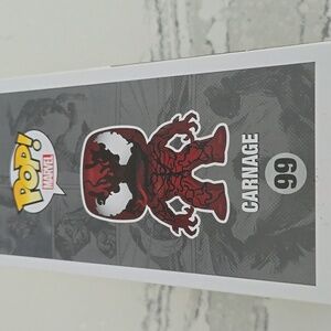 Funko Pop! Marvel Carnage figure. Features red and black design. Vinyl bobble-head. Perfect for collectors.
