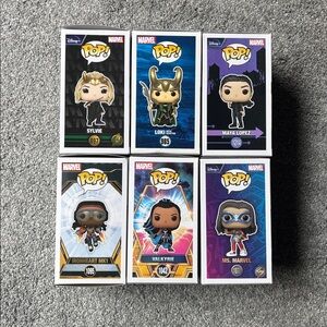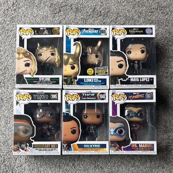 Set of six Funko Pop figures featuring characters from Marvel. Includes Sylvie, Loki, Maya Lopez, Ironheart MK1, Valkyrie & Ms. Marvel. Willing to sell separately.
