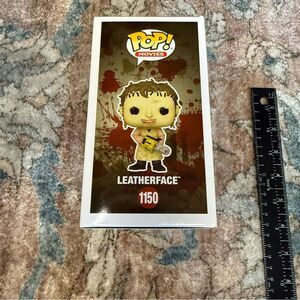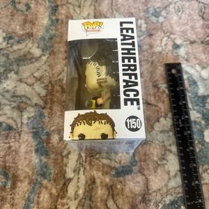 Collectible Leatherface Funko Pop from Texas Chainsaw Massacre. Features a detailed design with a yellow and brown color scheme. Some spots on front packaging.