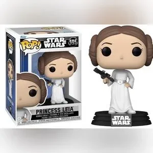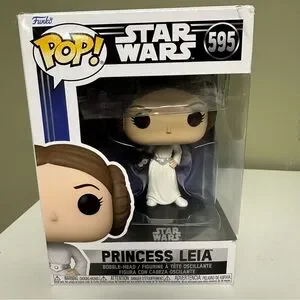 Funko Pop figure of Princess Leia 595. Features classic white attire and brown hair.